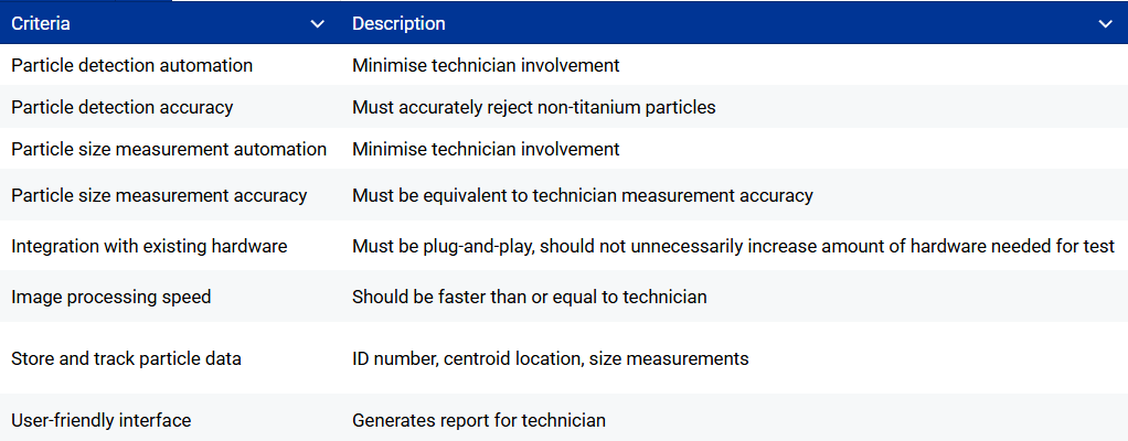 the image processing software we are utilizing to detect titanium particles and measure them in order to record it and run it through a pass/fail system. We define a threshold at which each slide has to be processed, if the software detects a slide content exceeding this set threshold, the handpiece will fail the quality control and be discarded.